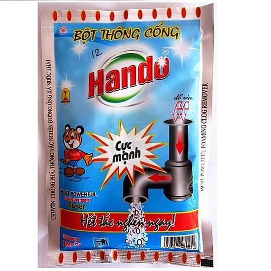 Hando là hàng nội địa Việt Nam. Thành phần chính gồm : Hydrogen peroxide, Sodiumhypo chlorite và Sodim silicat có tác dụng xử lý tốt các chất thải gây tắc nghẽn. Đặc biệt, chúng có mùi thơm nhẹ nhàng chứ không gây mùi khó chịu như các loại bột thông cống khác.